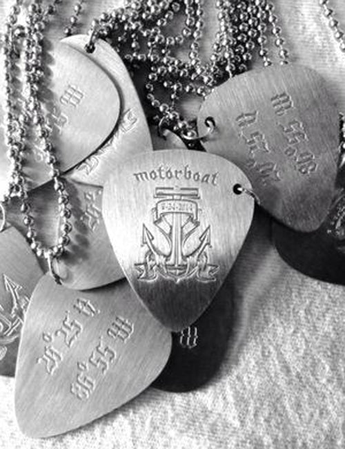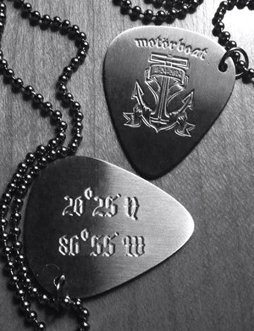 Commemorative 2014 Motörhead’s Motörboat Guitar Pick & Chain. Made of surgical steel, these very cool picks feature the Motörboat logo on one side, and the latitude and longitude coordinates for Cozumel, Mexico, on the back! Includes 21″ ball-chain.